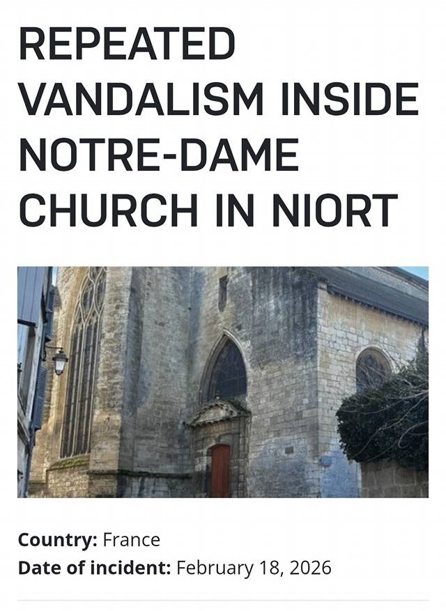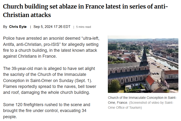 2025. – Crkve u Francuskoj su pod napadom, a mediji i politički establišment prave se da to ne primjećuju. Prošle godine svjedočili smo požarima u povijesnim crkvama u Rouenu, Saint-Omeru i Poitiersu – svaka od njih još jedna mračna statistika u sve većoj krizi. Godinama svjedočimo da su kršćanska mjesta bogoslužja meta paljevina i vandalizma. Ipak, do sada je službena potvrda razmjera problema znatno izostajala. To se promijenilo. Francuska teritorijalna obavještajna služba izvijestila je o 30-postotnom porastu kriminalnih požara crkava u 2024.