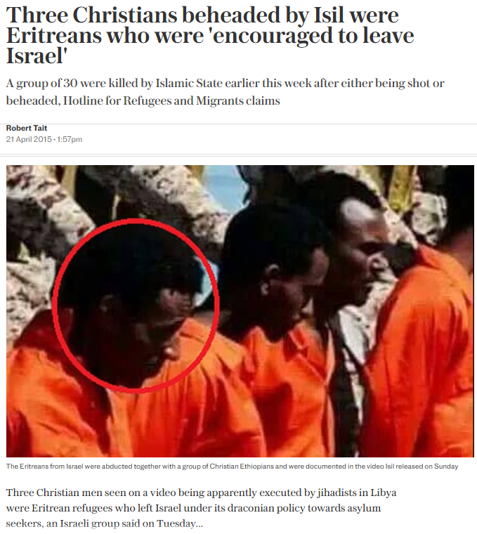 Skupina od 30 ljudi ubijena je ranije ovog tjedna od strane Islamske države, bilo hicima iz vatrenog oružja ili odrubljivanjem glava, tvrdi Telefonska linija za izbjeglice i migrante. Trojica kršćana koje su džihadisti navodno pogubili na videu u Libiji bili su eritrejske izbjeglice koje su napustile Izrael zbog njegove drakonske politike azila, priopćila je u utorak izraelska organizacija.