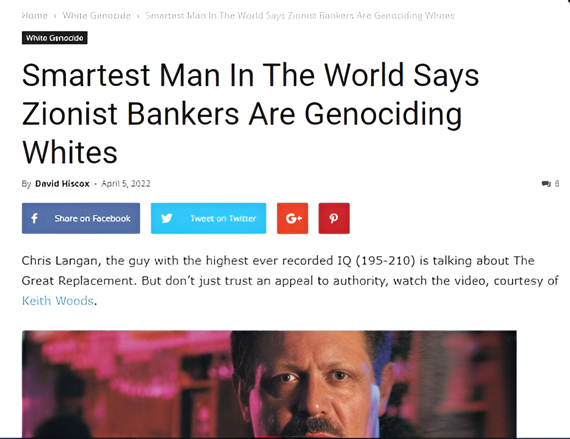 Chris Langan, s procijenjenim IQ-om između 195 i 210, više je puta u intervjuima i na društvenim mrežama govorio o "Velikoj zamjeni" te optužio određene skupine, uključujući "cionističke bankare", za planiranje genocida nad bijelom rasom.