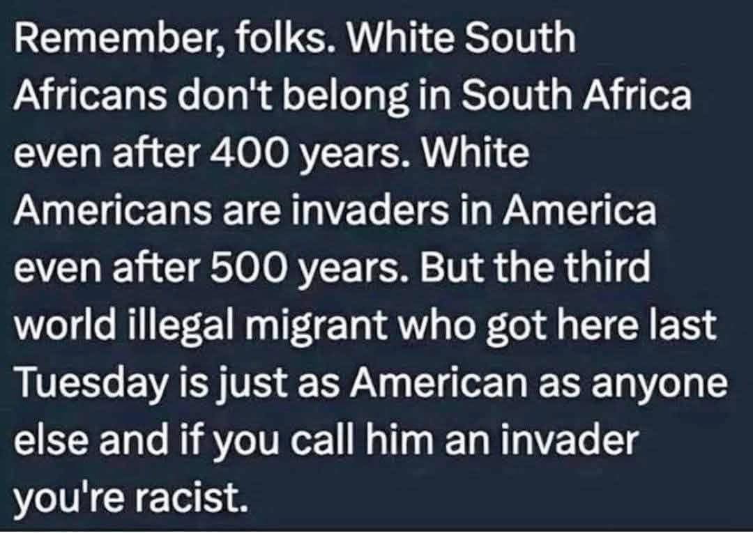 Liberals emphasize that you cannot hold all Muslims accountable for Islamic attacks, yet at the same time they regard all white people as collectively guilty of slavery in the past. According to them, whites have no right to South Africa, even after four centuries, and no right to America, even after five centuries. By contrast, a migrant from the Third World who arrived in Europe yesterday is immediately considered just as European as the original Europeans — and anyone who disagrees is branded a 'racist'.