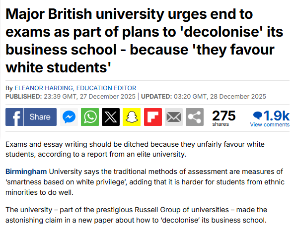A current example is the University of Birmingham, which has proposed abolishing exams and essays because they supposedly "favor white privilege."
