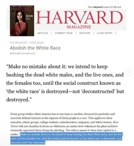 "The goal of abolishing the white race is on its face so desirable that some may find it hard to believe that it could incur any opposition other than from committed white supremacists... Keep bashing the dead white males, and the live ones, and the females too, until the social construct known as 'the white race' is destroyed." – Noel Ignatiev