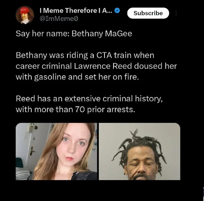 In 2025, following the attack on Iryna… Bethany MaGee, 26, was set on fire aboard a Chicago Blue Line train by career criminal Lawrence Reed, who has over 70 prior arrests. Like Iryna Zarutska, she was a supporter of BLM. Not a single protest. Or worldwide media coverage.