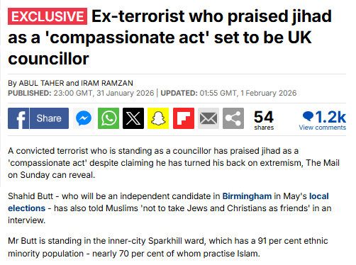 A notable example of controversial figures entering the political sphere is Shahid Butt. Sentenced to five years in prison in Yemen in 1999, he was part of a group accused of plotting attacks on British and Western targets, including the British consulate, a hotel, and a church. In 2026, he is set to run for the position of UK councillor.