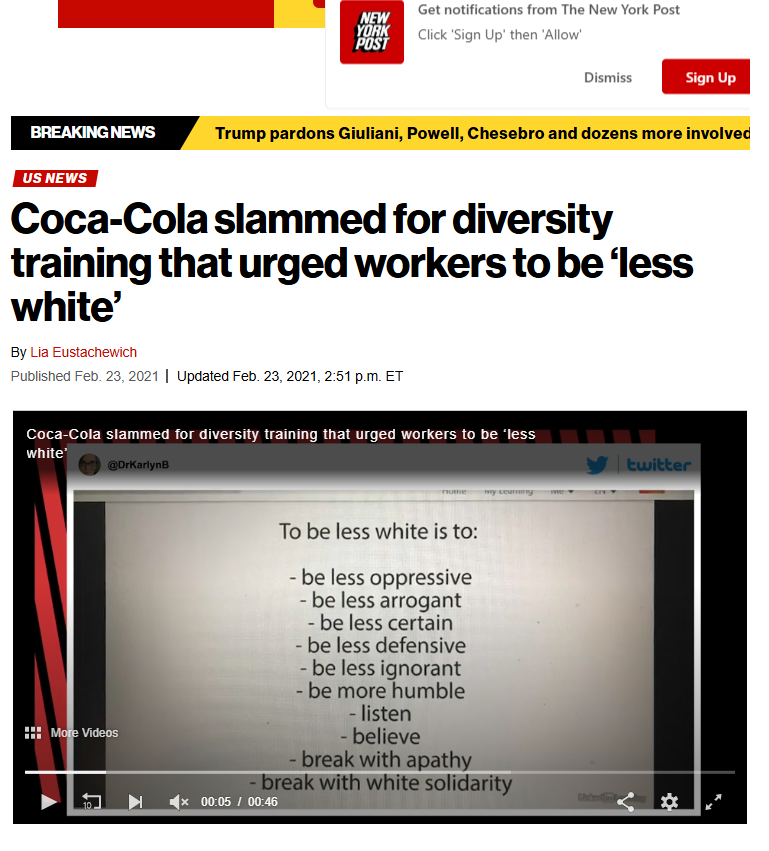 In februari 2021 kreeg Coca‑Cola felle kritiek nadat berichten opdoken over een interne diversiteitstraining die werknemers naar verluidt aanmoedigde om "minder wit" te zijn. Het trainingsmateriaal, dat gekoppeld was aan een online cursus, suggereerde dat "minder wit" betekende: minder arrogant, defensief en overtuigd zijn, en juist meer nederig en open om anderen te begrijpen.